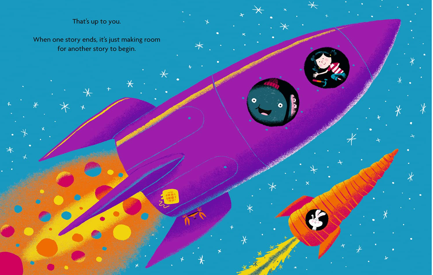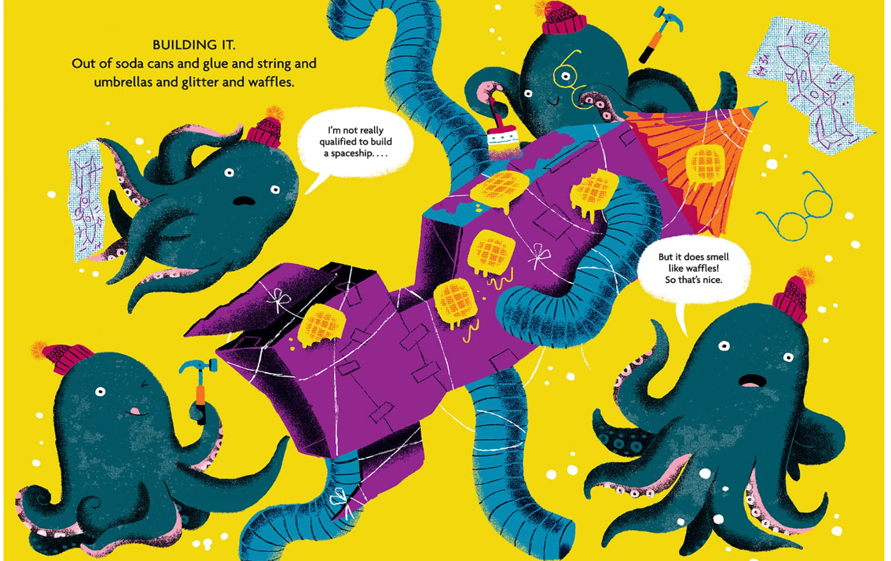 It begins with an octopus who plays the ukulele. Since this is a story, the octopus has to want something—maybe to travel to faraway galaxies in a totally awesome purple spaceship. Then the octopus sets out to build a spaceship out of soda cans, glue, umbrellas, glitter, and waffles. OK, maybe the octopus needs some help, like from an adorable bunny friend, and maybe that bunny turns out to be . . . a rocket scientist? (Probably not.) But could something even more amazing come to pass? Debut author Maggie Tokuda-Hall, with the help of illustrator Benji Davies, sets up an endearingly funny story, then hands the baton to readers, who will be more than primed to take it away.